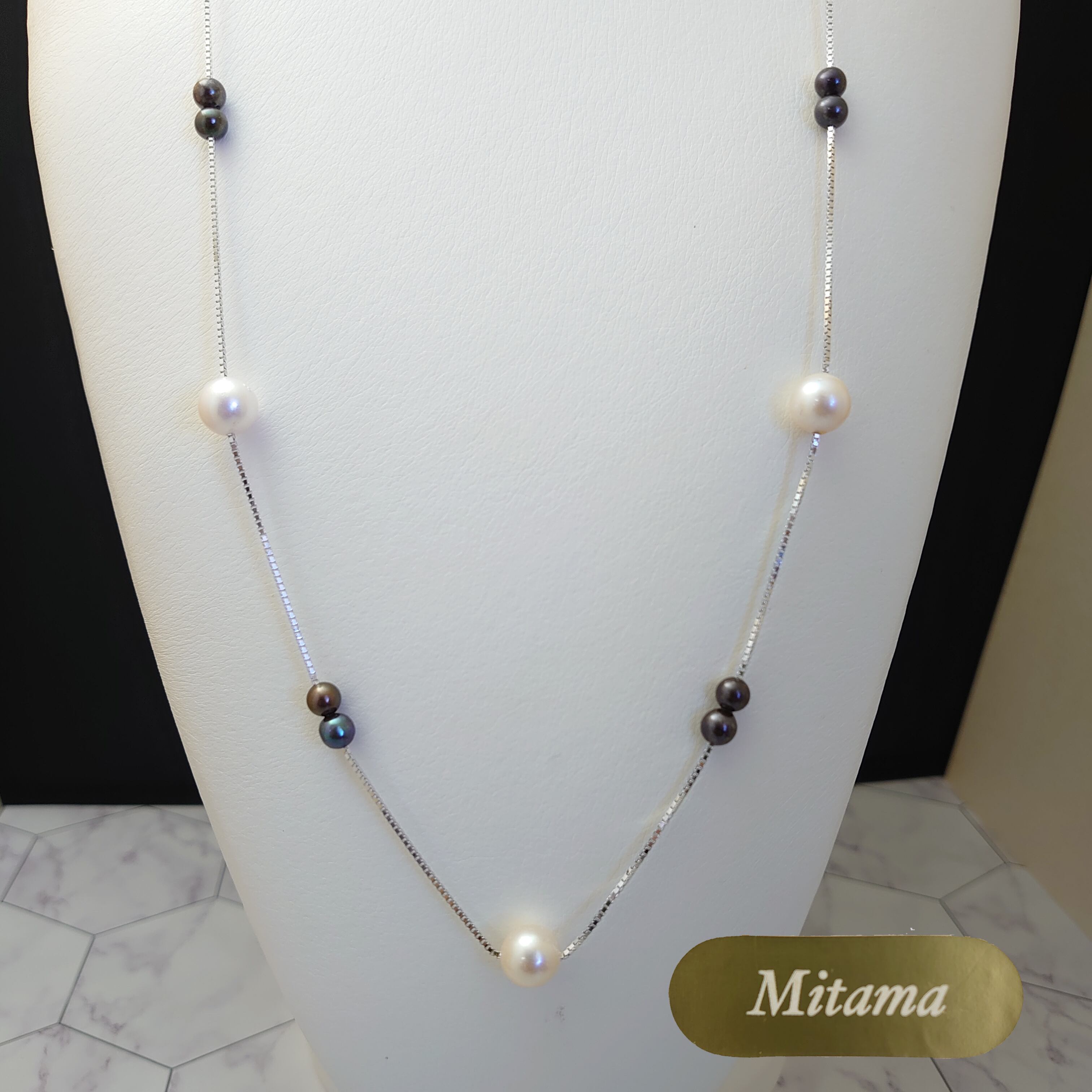 ホワイトカラーと小さめブラックカラーのあこや真珠を合わせた、